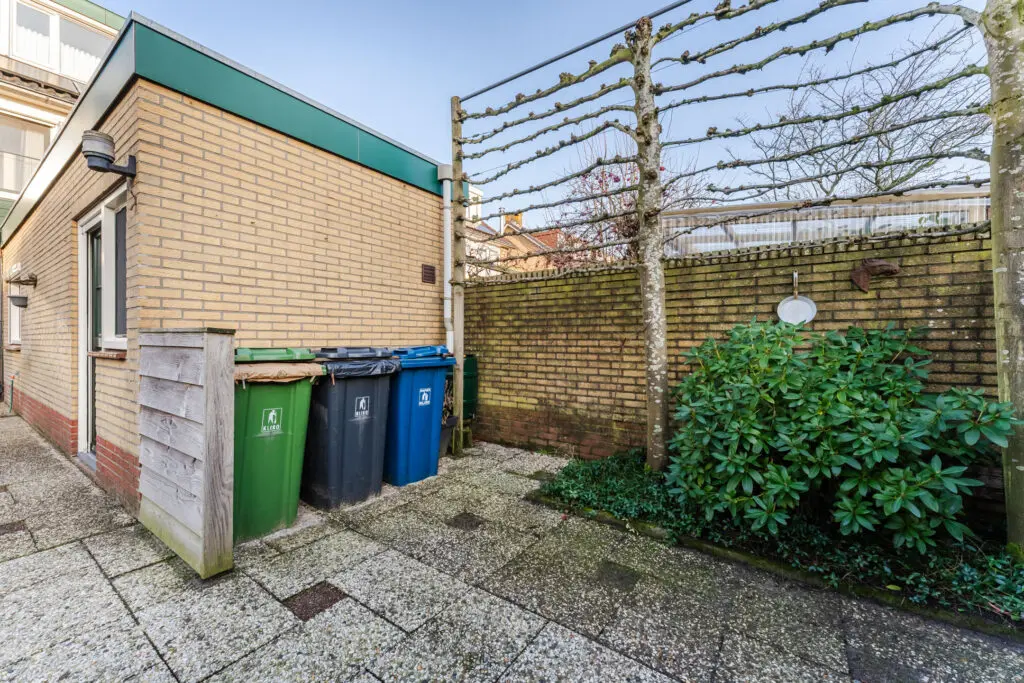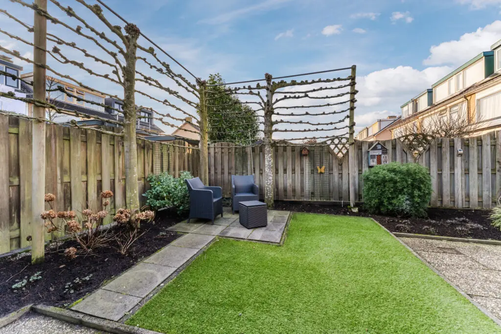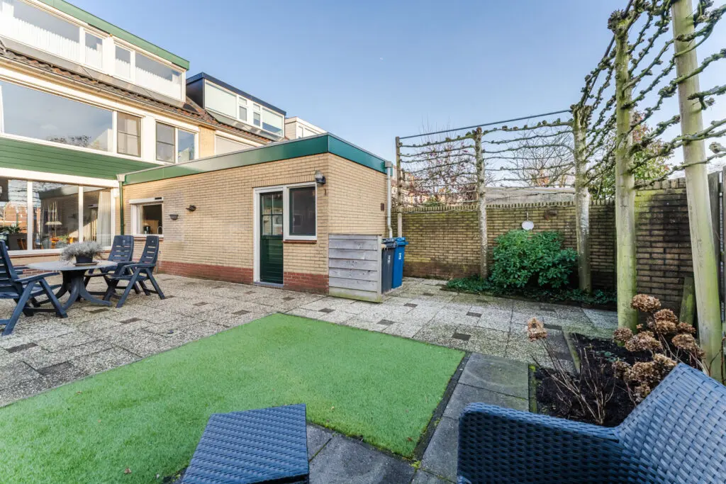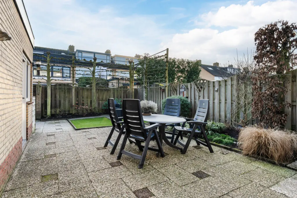 Buitenleven op z’n best De royale tuin heeft veel privacy in de zomer en ligt heerlijk op het zuiden. Of je nu wilt tuinieren, ontspannen met een goed boek of lange zomeravonden doorbrengen met vrienden en familie — hier kan het allemaal. Dankzij de gunstige ligging geniet je de hele dag van zon én schaduwplekken. Achter de garage bevindt zich nog een aangebouwde stenen berging, zodat er veel ruimte is om je spullen op te slaan of een hobby uit te oefenen. Verder kunt u via de poortdeur aan de achterzijde van de tuin de openbare weg bereiken.