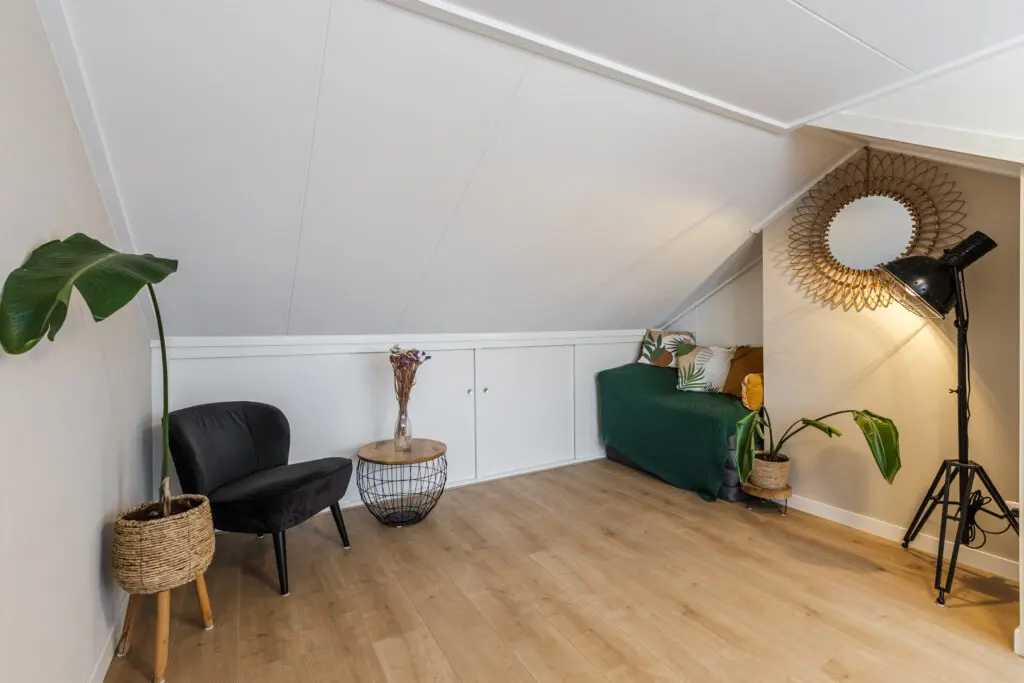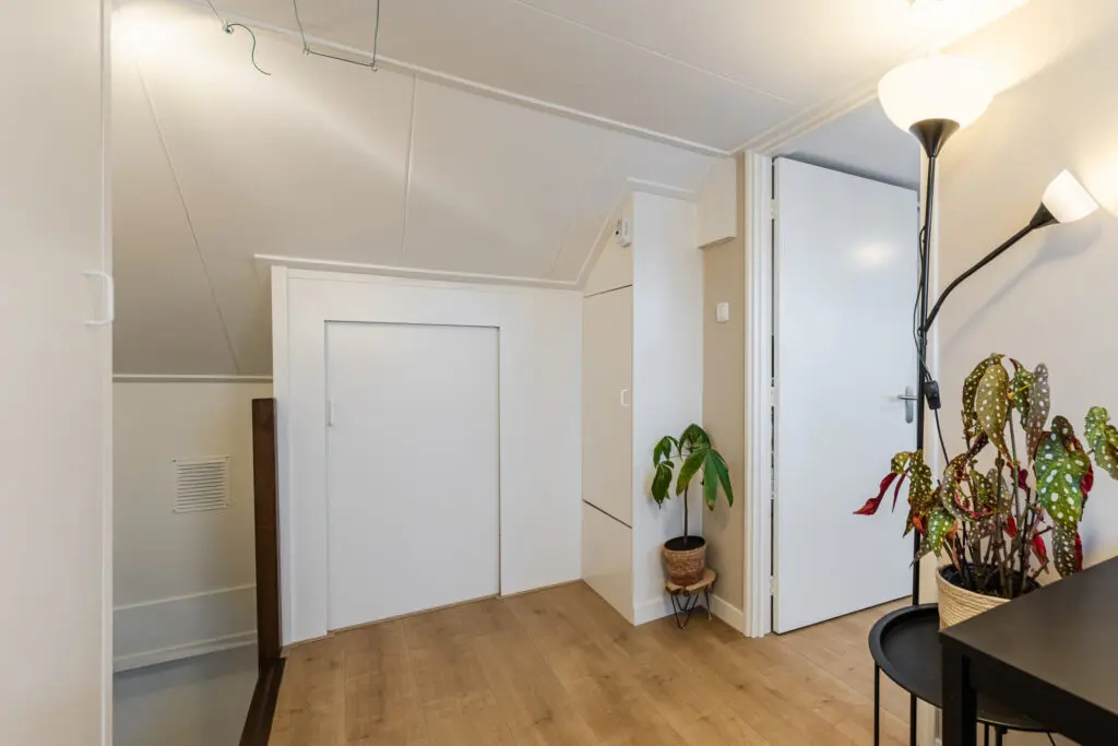 Middels een vaste trap kom je uit op de bovenste verdieping waar zich op de zeer ruime overloop ook de HR combiketel bevindt. De overloop is zelfs voor een extra werkplek geschikt. Verder is er nog 1 slaap/werkkamers gecreëerd door middel van het plaatsen van een groot dakkapel aan de achterzijde van de woning. Ook zijn er veel knieschotten geplaatst voor het opbergen van uw spullen.